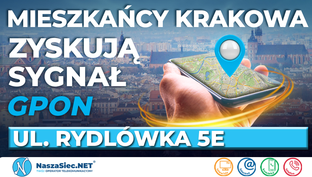 Budynek przy ul. Rydl贸wka 5E w Krakowie zosta艂 pod艂膮czony do nowoczesnej infrastruktury 艣wiat艂owodowej GPON. Oznacza to dost臋p do ultraszybkich us艂ug NaszaSiec.NET, doprowadzanych bezpo艣rednio do mieszka艅.